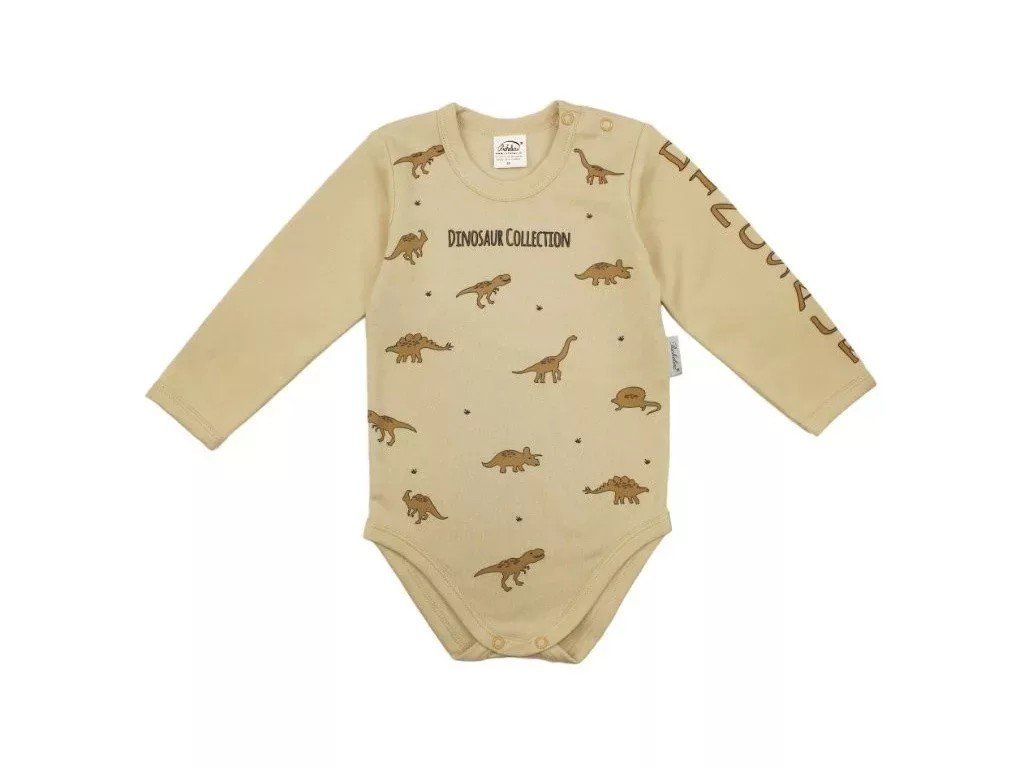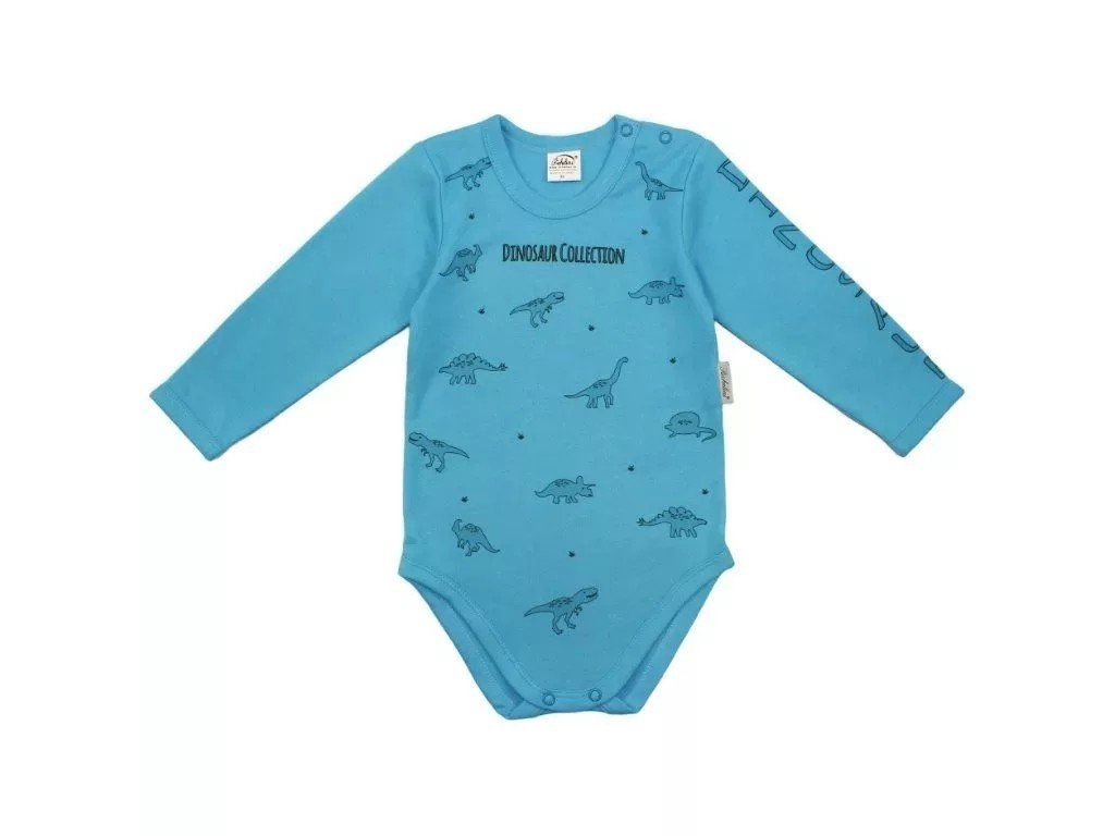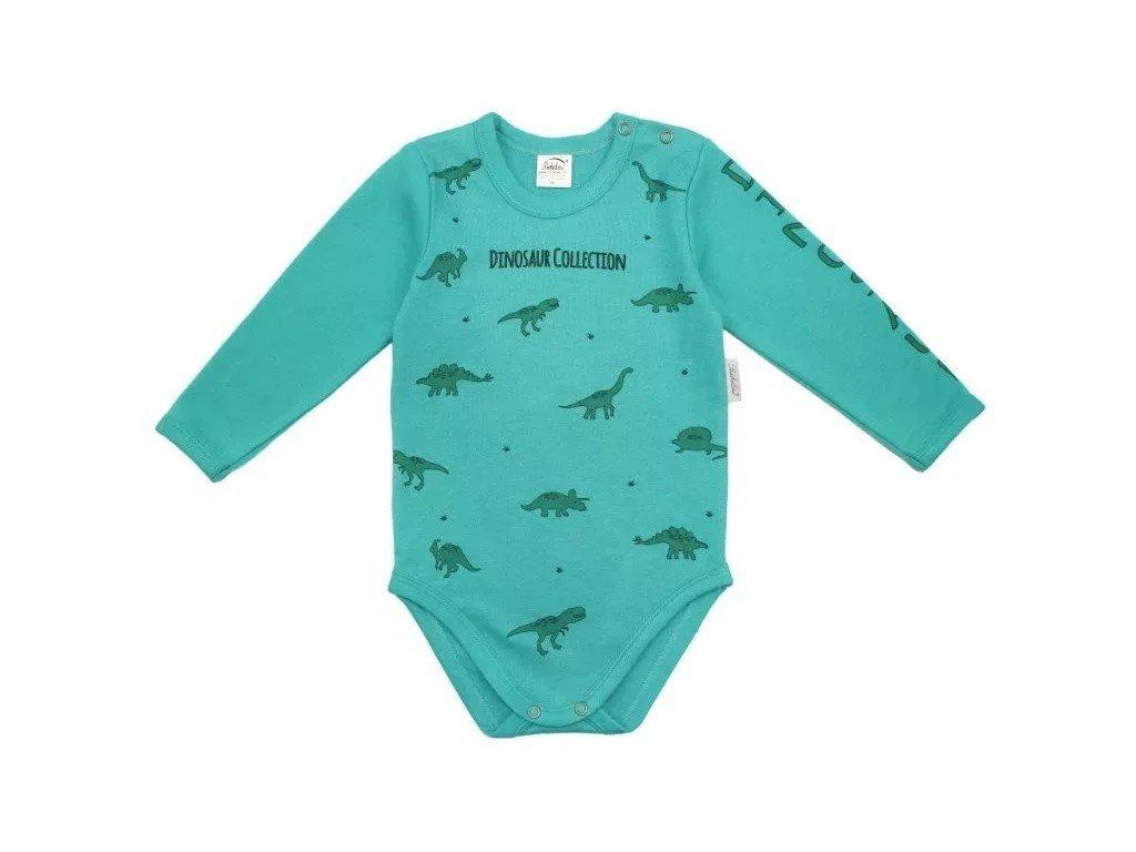 Body DINOSAUR z kvalitnej bavlny s kreatívnou potlačou dinosauríkov. Použitá kvalitná stálofarebná potlač. Zapínanie na ramenách a medzi nôžkami na patentné gombíky zjednoduší každodenné obliekanie a vyzliekanie.