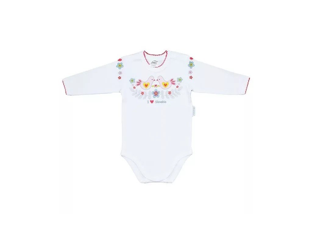 Máte radi folklórne motívy, tak potom tieto body sú určené práve pre vašu slečnu. Body KVETKA s dlhým rukávom s kvalitnou potlačou na prednom diely zaručí dlhú životnosť výrobku. Zapínanie na ramenách a medzi nôžkami na patentné gombíky zjednoduší každodenné obliekanie a vyzliekanie. Okolo krku a na konci rukávoch ozdobné háčkovanie.