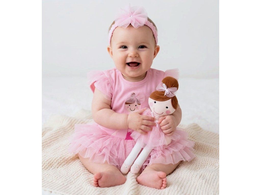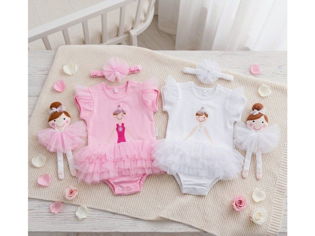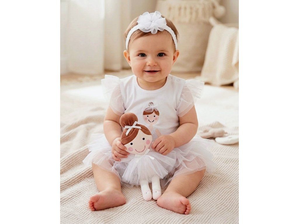 Body BALERÍNA s krátkym lupienkovým rukávom sú vyrobené z 100% organickej bavlny. Prostredníctvom patentných gombíkov po oboch stranách ramien je zabezpečené pohodlné obliekanie dieťatka.  Na prednom diely je výšivka baleríny, pričom je z vnútra ochrana tak, aby telíčko dieťatka neprichádzalo do styku s výšivkou. V dolnej časti bodíkov sú tri bohato riasené volániky, ktoré vytvárajú sukničku baleríny. Hlavičku prizdobí čelenka s krásnym tylovým kvietkom. Súčasťou darčekového balenia je látková bábika.