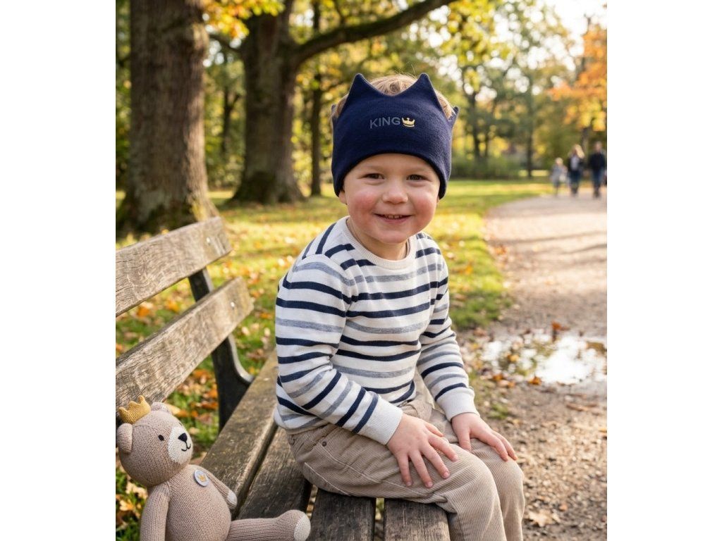 Štýlová čelenka s výšivkou, ktorá spoľahlivo ochráni ušká vášho dieťatka pred vetrom a chladom. Vyrobená z organickej bavlny s prímesou elastanu, čo zaručuje pohodlné nosenie a dokonalé prispôsobenie sa hlavičke. Čelenka je ozdobená jemnou zlatou výšivkou korunky a nápisom „KING“ pre chlapcov alebo „PRINCESS“ pre dievčatá, čo jej dodáva elegantný vzhľad.
