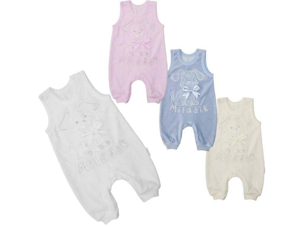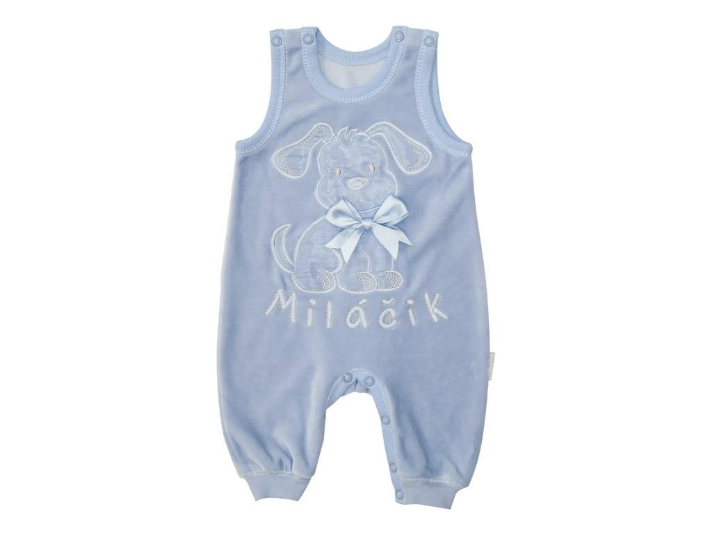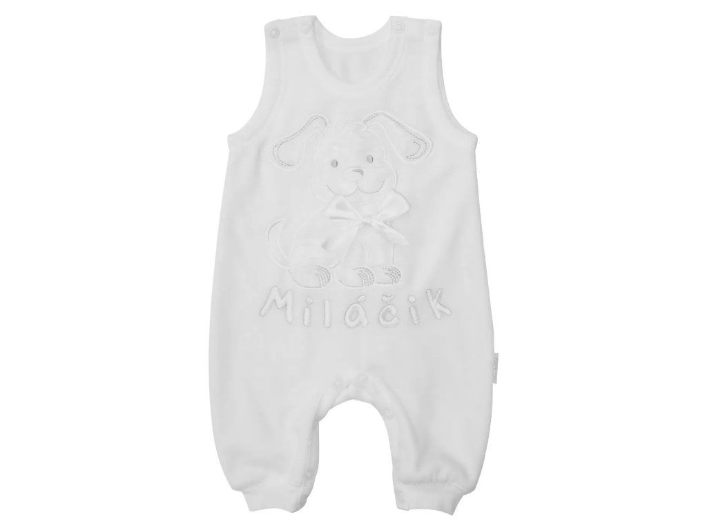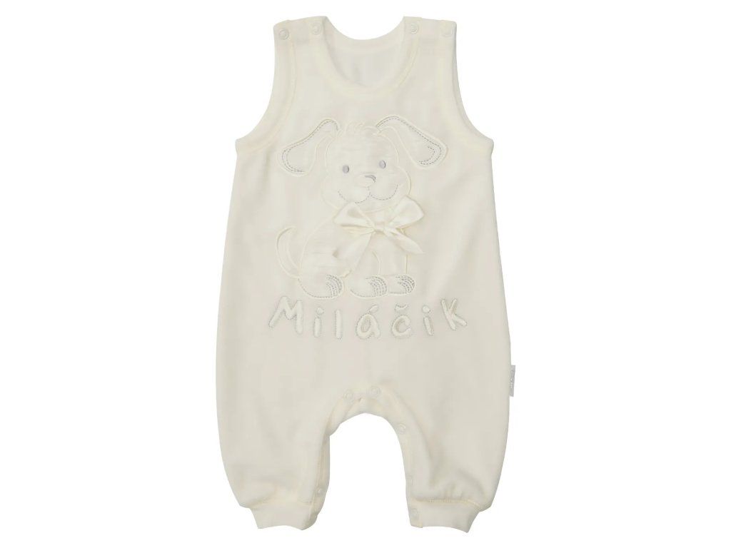 Sviatočné dupačky Miláčik sú vyrobené z jemného a teplého zamatu. Na spodu sa nachádza pružný patent, ktorý zabezpečuje, že dupačky pekne sedia a nevyhŕňajú sa. Zapínanie na ramienkach a medzi nožičkami na patentné gombíky uľahčuje obliekanie, vyzliekanie a prebaľovanie dieťatka. Na prednom diely roztomilá aplikácia psíka s mašličkou.