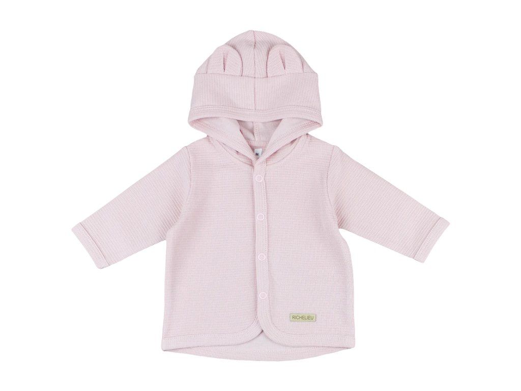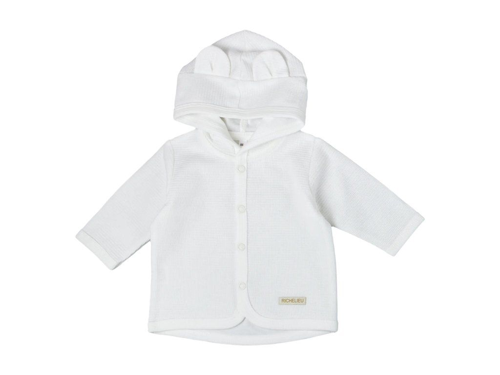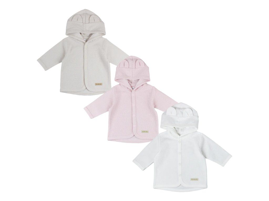 Moderný kabátik s kapucňou a všitými uškami je perfektným oživením šatníka vášho dieťatka. Zadný diel kabátika je mierne predlžený a po celom obvode  lemovaný. Zapínanie vpredu na patentné gombíky zabezpečí rýchle a pohodlné obliekanie a vyzliekanie.