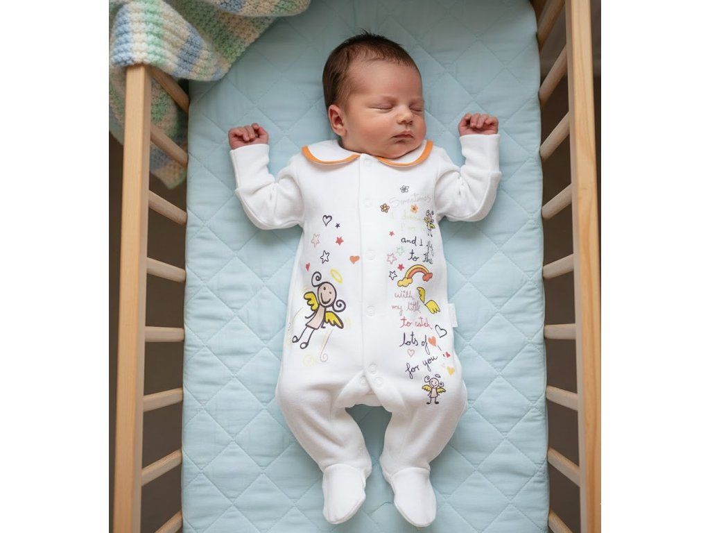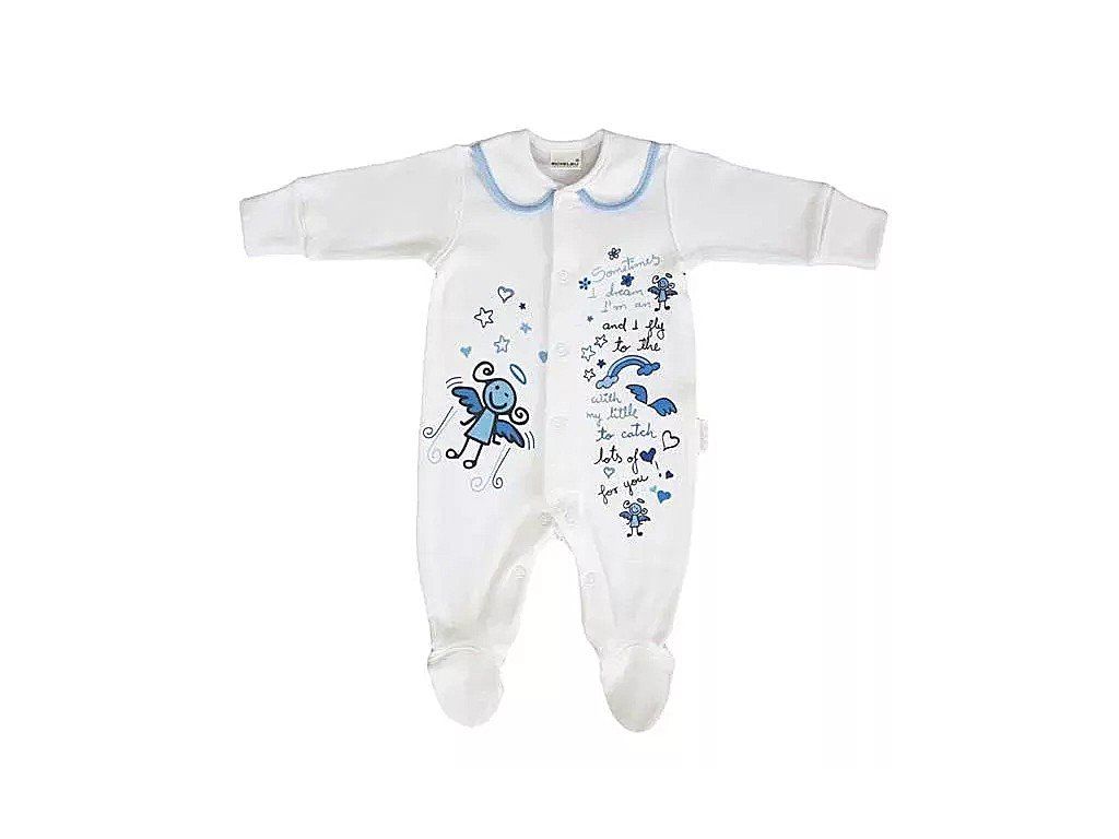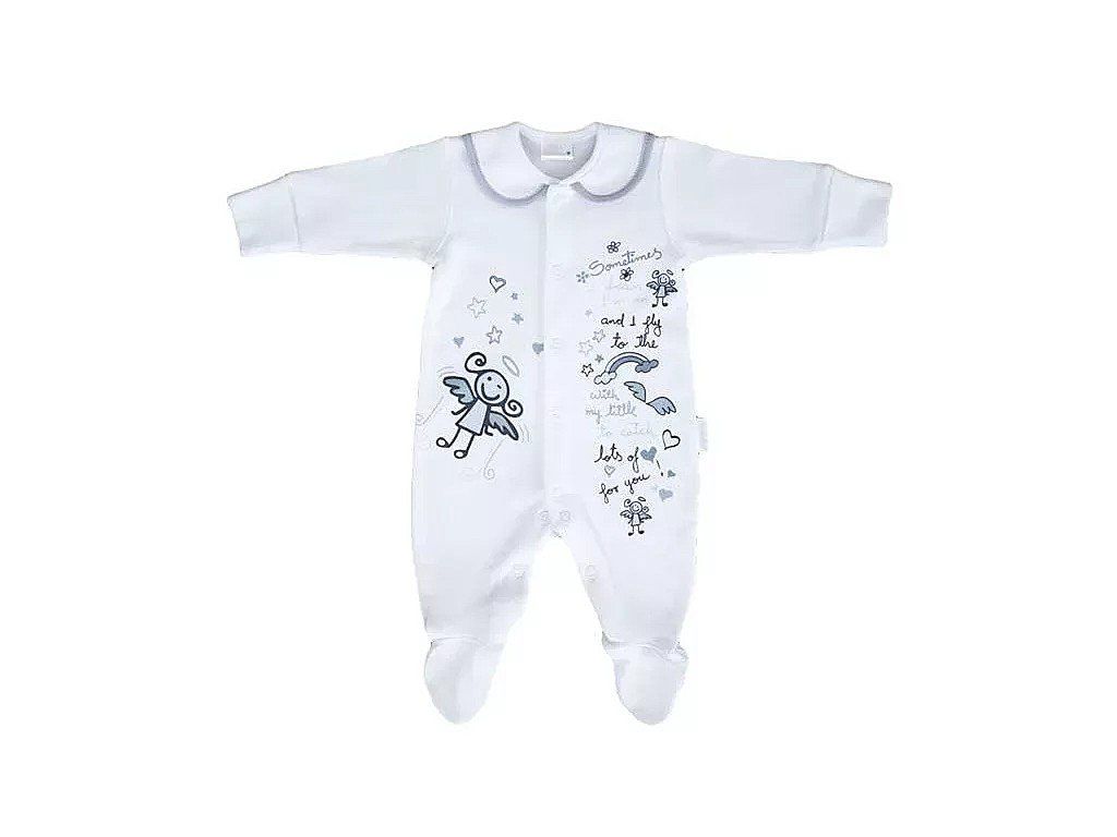 Detský overal Angel s dlhým rukávom z kvalitnej 100% bavlny s potlačou DTG (potlačené farby sú na vodnej báze, čím sa zaručí jemnosť potlače na dotyk). Zapínanie na patentné gombíky po celej dĺžke. Rukávy ukončené do pružného zhrňovacieho patentu. Farebne lemovaný golierik. Vpredu potlač veľkého anjelika a textu na zadnej strane anjelské krídla.