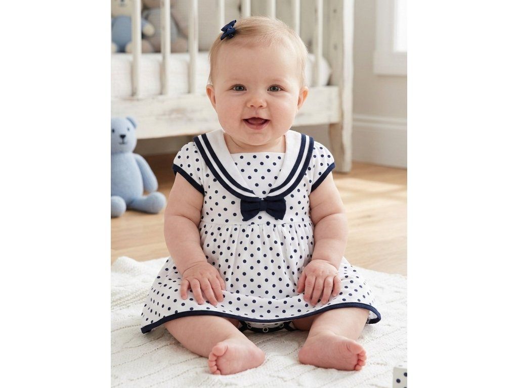 Praktické bavlnené šaty body bodkované v námorníckom štýle s krátkym rukávom, sukničkou a veľkým ležatým golierom. Zdobené lemovaním s mašličkou pod golierom. Šaty sú vyrobené z kvalitnej bavlny, sú pohodlné a ľahko dýchateľné počas teplých dní. Ich jednoduchý strih a pohodlie z nich robia ideálnu voľbu na letné dni.