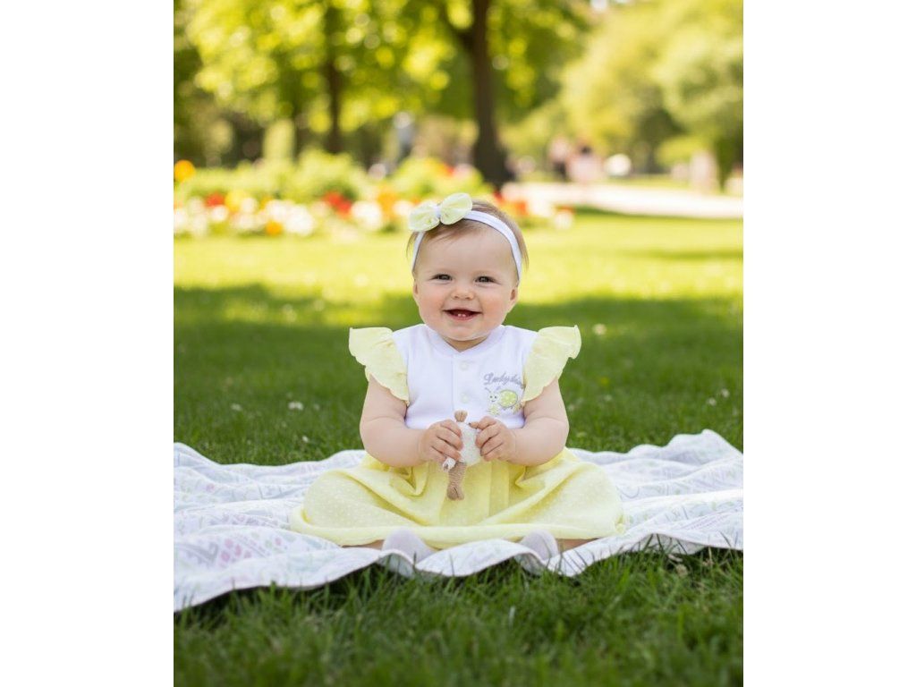 Roztomilé šaty body zo vzorovanej 100% organickej bavlny s výšivkou. Zapínanie pod krkom na dva patentné gombíky. V ramenách sú všité decentné volániky. Body sú spojené v mieste sedielka a majú zapínanie taktiež na patentné gombíky. Doplnkom je čelenka v štýle mašličky.