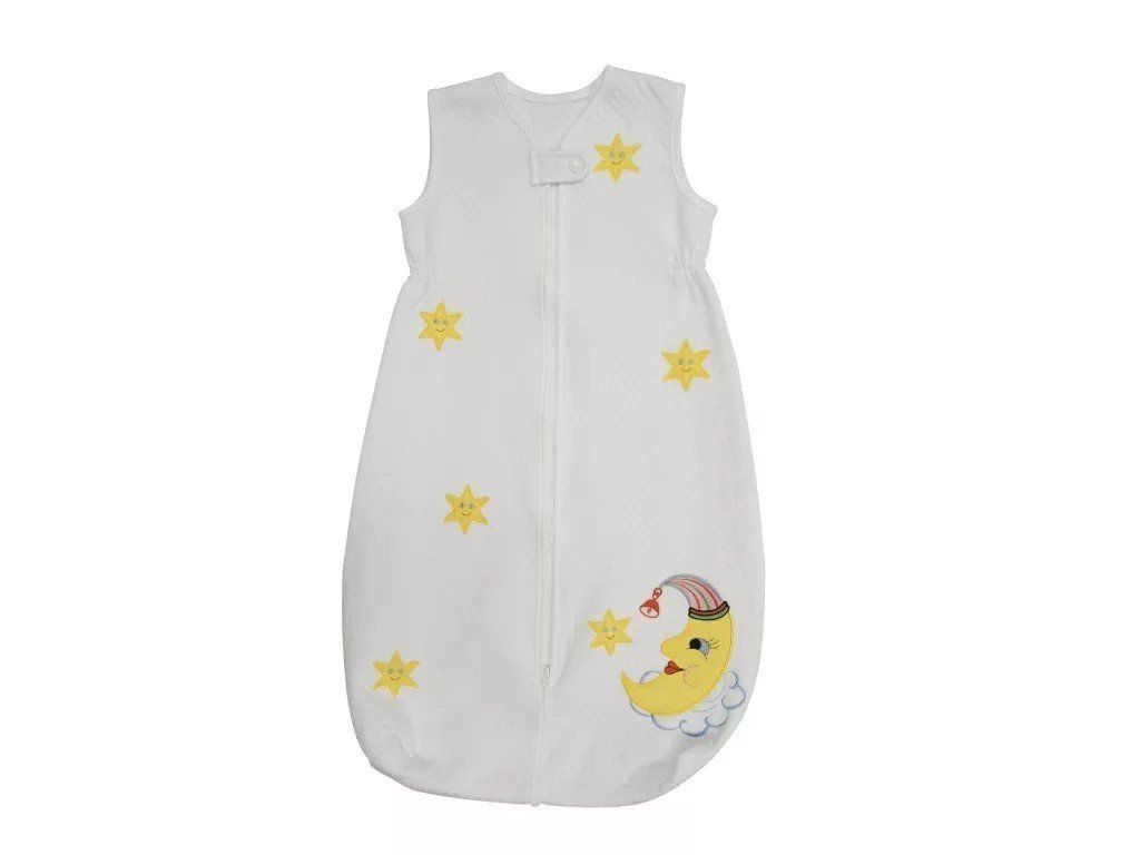 Spací vak Hviezdička je vyrobený z príjemného materiálu so žakárovým vzorom. Samotné spracovanie materiálu navyšuje jeho hrejivosť pridaním polyesteru medzi dve vrstvy bavlny. V prednej časti zapínanie na zips s ochranou na bradu. Celá predná časť zdobená vyšívanou aplikáciou mesiačika a hviezdičiek.