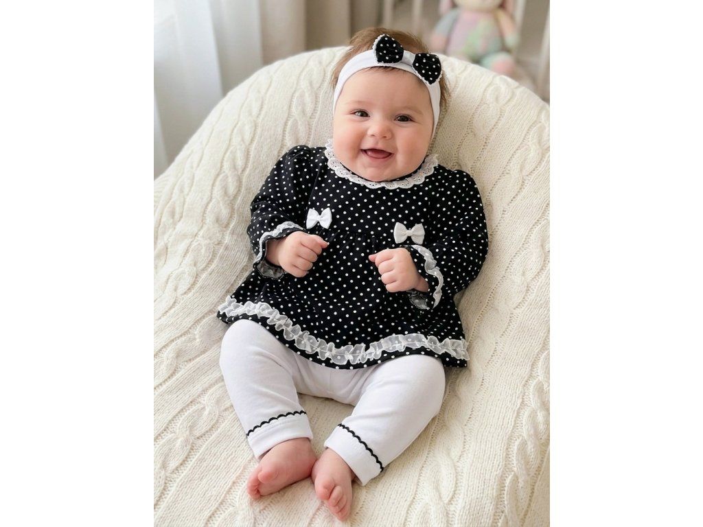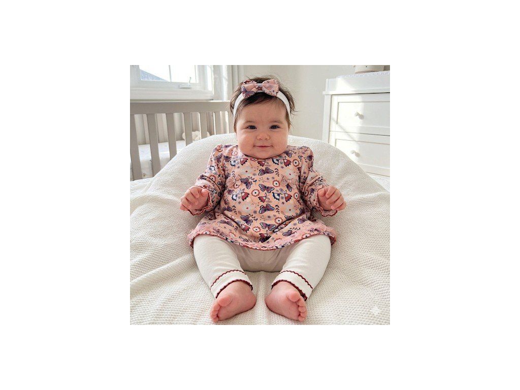Rozkošná súprava BIANKA je 2-dielna súprava zložená z tuniky a legín. Dopĺňa ju elegantná čelenka s mašličkou. Tunika je vyrobená zo 100% bavlny. Na rukávoch a na spodku legín ozdobné riasenie. Na hrudníku dve malé mašličky. Legínky sú elastické vyrobené zo zmesi: 96% bavlny a  4% elastanu.