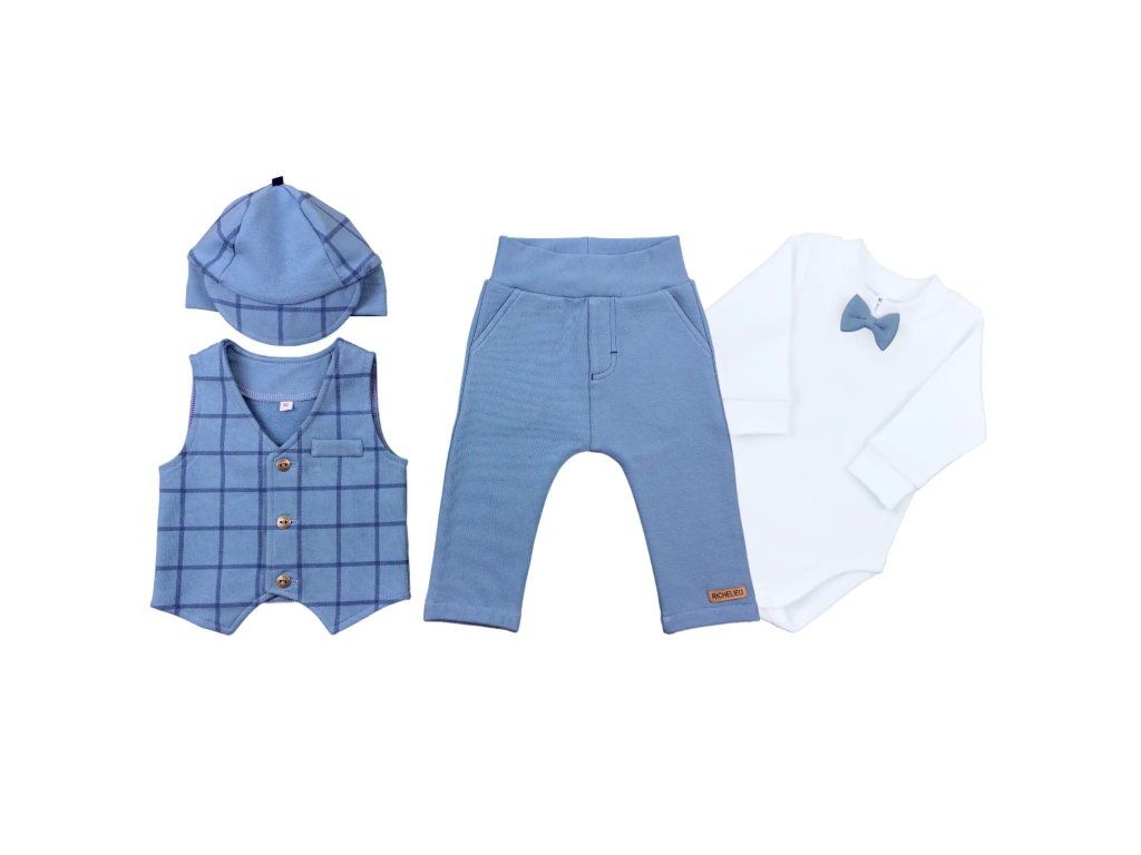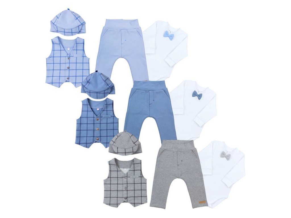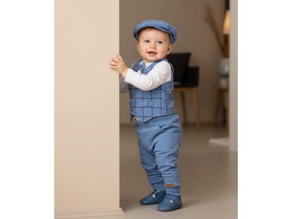 Komplet pozostáva z pohodlných nohavíc s dvomi funkčnými vreckami, ktoré okrem praktického využitia dodávajú súprave moderný vzhľad. V páse majú nohavice široký zhrňovací pás, ktorý jemne obopne bruško a neškrtí. Vestička má klasický elegantný strih so zapínaním na tri gombíky, čím celkový outfit pôsobí uhladene a slávnostne. Čerešničkou je štýlová čiapka ušitá vo forme malého baretu so šiltom – originálny doplnok, ktorý robí z tejto súpravy naozaj výnimočný kúsok.
