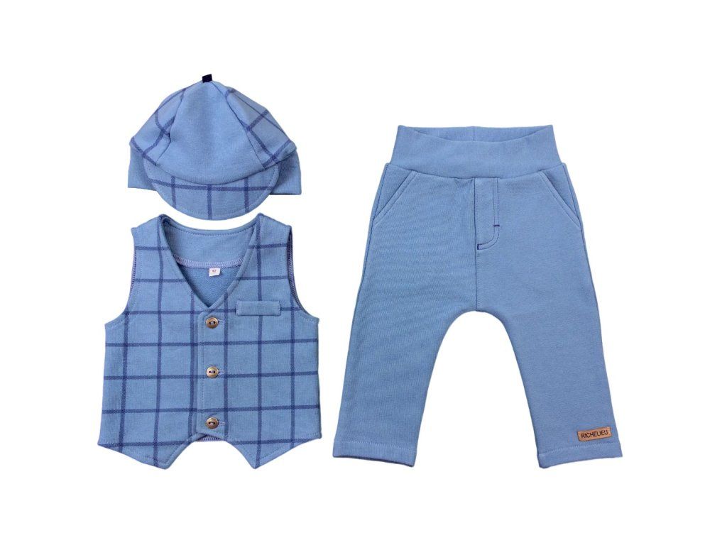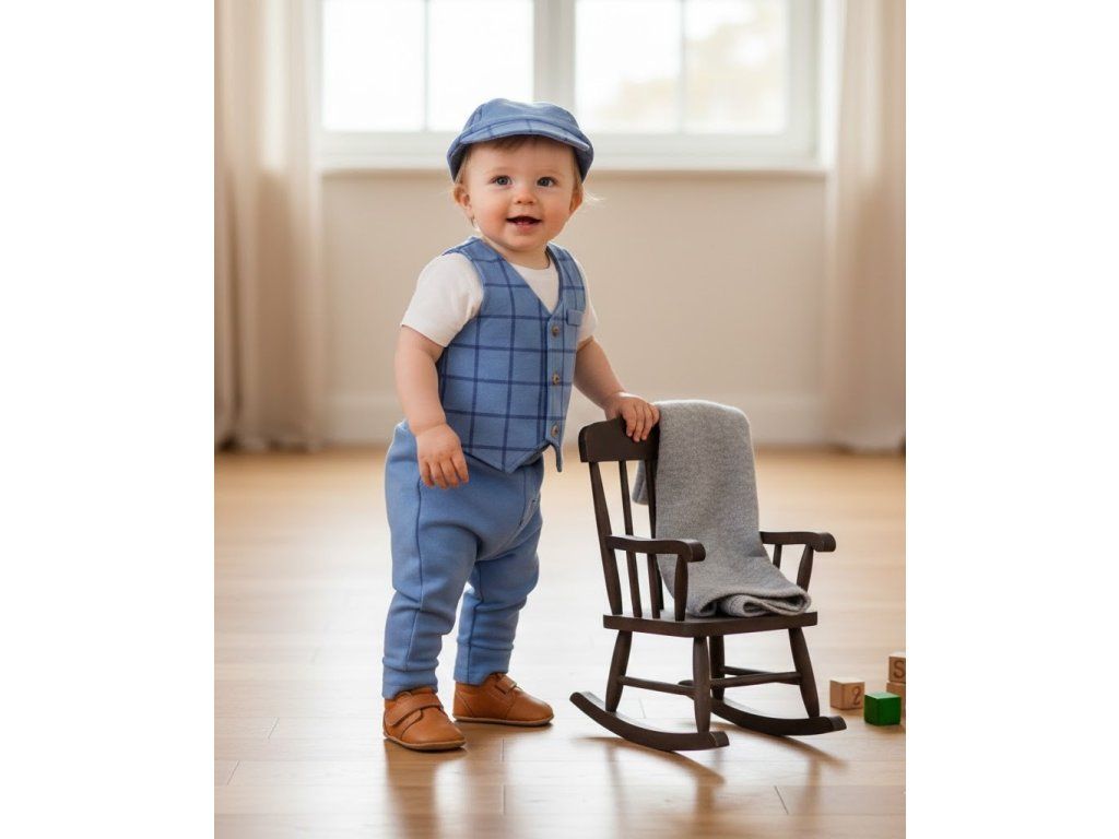Štýlové nohavice sú doplnené dvoma funkčnými vreckami a majú širší pás z pružného nápletu, ktorý sa jemne prispôsobí brušku a poskytuje maximálny komfort. Vesta sa zapína na tri klasické gombíky a jej elegantný strih dáva celej súprave slávnostný nádych. Štýlová čiapočka v tvare baretu so šiltom potom celý outfit dokonale dopĺňa a dodáva mu originálny vzhľad.