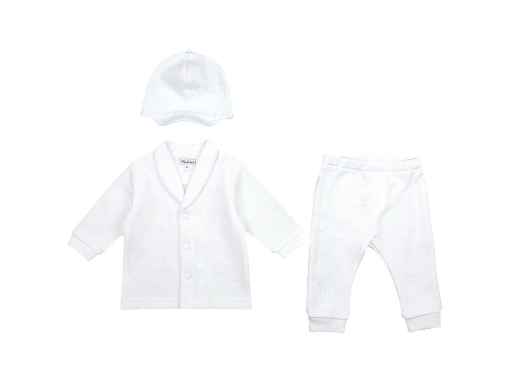 Elegantná trojdielna súprava FILIPKO pre chlapcov. Vyrobený je z mäkkej pleteniny s jemným počesom – podobným ako pri moherovej priadzi. Tento materiál je príjemný na dotyk, hrejivý a zároveň priedušný, vďaka čomu poskytuje dieťatku maximálny komfort počas nosenia. Svetrík má prehĺbený výstrih, ktorý mu dodáva moderný a elegantný nádych, je zdobený saténovou výpustkou. Zapínanie po celej dĺžke na patentné gombíky. Rukávy sú ukončené pružným patentom. Nohavice sú v páse na pružnú gumičku a ukončené patentom. Tretím komponentom v súprave je čiapka na spôsob šiltovky – šilt lemovaný saténovou výpustkou. Kombinácia skvelého dizajnu a kvalitného materiálu je ideálna nielen na slávnostné príležitosti, ale aj na každodenné nosenie.