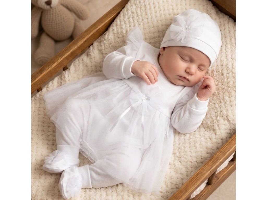 Súprava IVUŠKA je set bodo-šatičiek, pančušiek, čelenky, čiapky a papučiek zo 100% bavlny. Okrem bavlny obsahuje aj doplnkový materiál tyl, vďaka ktorému dodáva súpravičke elegantný vzhľad a hodí sa na rôzne sviatočné príležitosti. Bodo-šaty majú zapínanie na ramenách po oboch stranách na patentné gombíky, všité volániky na rukávoch a všitá suknička s ozdobným kvietkom. Rukávy sú ukončené do pružných manžetiek. Pančušky a papučky sú taktiež bavlnené s našitými tylovými kvetinami na papučkách. Čiapka a čelenka je vyrobená zo zmesového pružného materiálu (96% bavlna, 4% elastan) a sú zdobené kvetinami.
