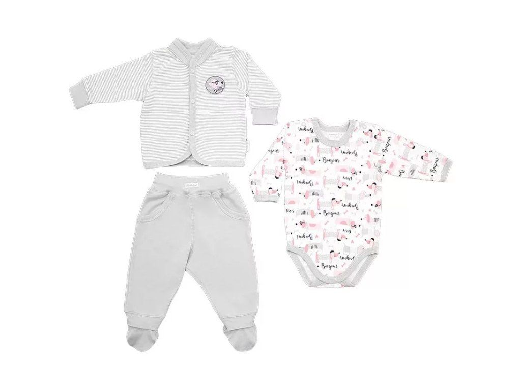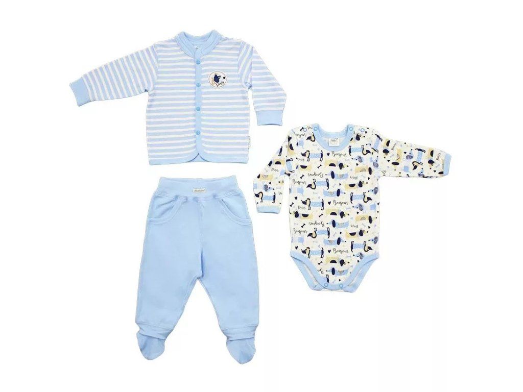 Praktická 3 dielna súprava Jaško z kvalitnej 100% organickej bavlny. Set sa skladá z polodupačiek s uzavretou nôžkou a pružným pásom, ktorý netlačí bruško dieťatka. Kabátik má zapínanie vpredu na patentné gombíky. Rukávy ukončené do pružnej manžetky. Body majú zapínanie na ramienkach a medzi nôžkami na patentné gombíky, čím sa uľahčuje obliekanie, vyzliekanie a prebaľovanie dieťatka.